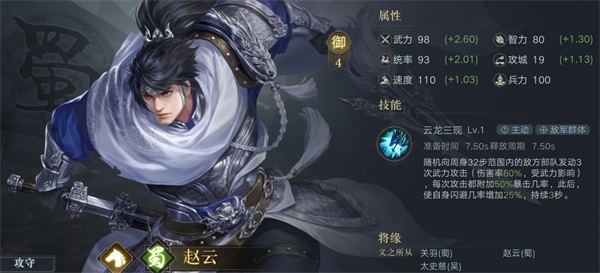 橙將趙云:御值4御,隨機對周邊32步的地方部隊發(fā)動3次武力攻擊,每次攻擊都有一半的暴擊率,并且,使自身的閃避增加,持續(xù)3秒。間隔7.5秒。