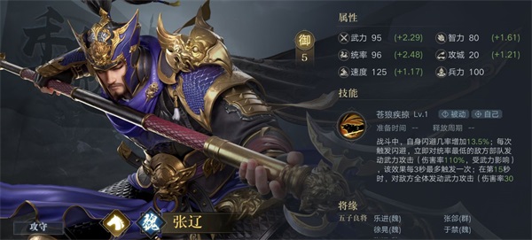 紫將張燕:御值4御,發(fā)動一次武力攻擊,并使自身暴擊幾率與閃避幾率增加,持續(xù)3秒。間隔7.5秒。