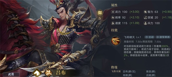 橙將漢呂布:御值5御,對目標發(fā)動一次攻擊,武力值高于目標造成雙倍傷害,并獲得傷害加成,可疊加3次,持續(xù)到戰(zhàn)斗結(jié)束。間隔7.5秒。