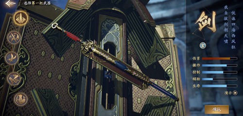 劍:近戰(zhàn)武器,各方面比較均衡,在傷害方面較為突出,招式靈動(dòng)犀利,也是電視劇中主角常用的武器。