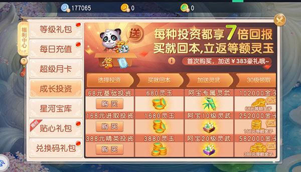 (新人玩家可以弄個首沖,送的寵物阿寶還可以,小r和中r玩家可以把月卡和三個成長基金買了,性價比比較高)。