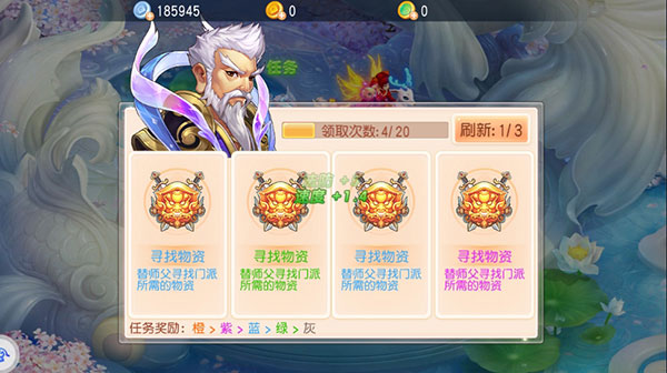 16級就沒有主線了,我們就遇到了游戲里的第一個日常活動師門任務(wù),每天可以做20次師門任務(wù),經(jīng)驗獎勵最高的是紫色任務(wù)>藍(lán)色任務(wù)>綠色任務(wù)》白色任務(wù)