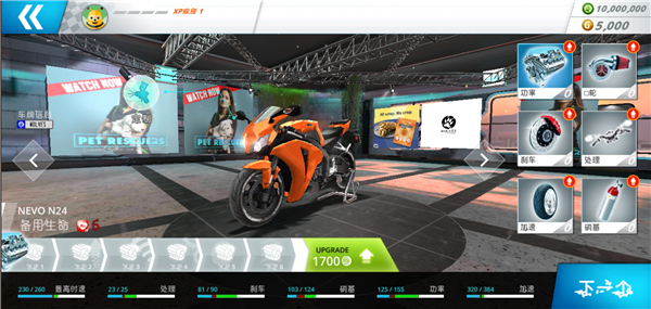3、在這里可以更改摩托車的配件,例如車輪、引擎、剎車等。