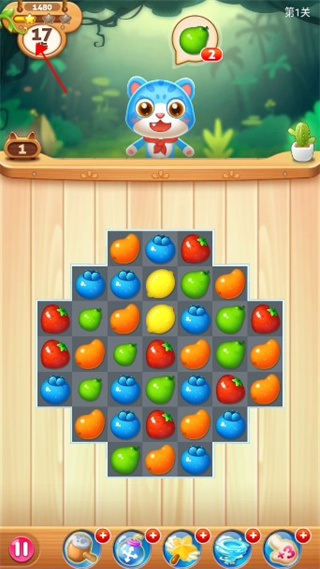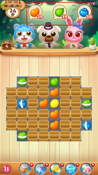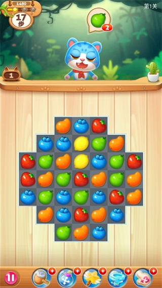 2、選擇關(guān)卡開始游戲,滑動手指讓三個及以上的相同水果橫豎相連即可消除。