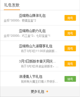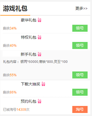 步驟3:或者直接查看“游戲禮包”,點(diǎn)擊領(lǐng)號(hào)、淘號(hào)、預(yù)定即可;