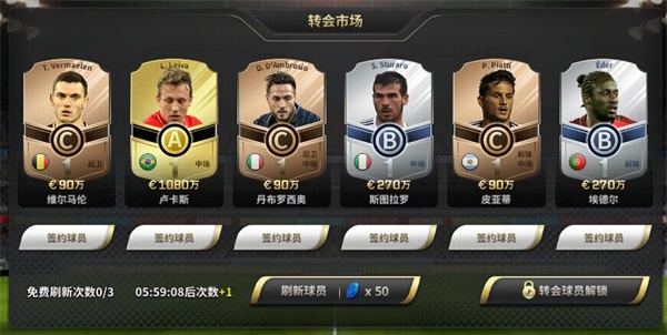 轉(zhuǎn)會(huì)市場(chǎng)每日有三次免費(fèi)刷新球員次數(shù),玩家可點(diǎn)擊球員查看屬性,仔細(xì)挑選自己想要的球員。這邊要提醒玩家的是,可要根據(jù)球隊(duì)位置招募球員,一支球隊(duì)只有前鋒,沒(méi)有防守球員也是不行的哦!