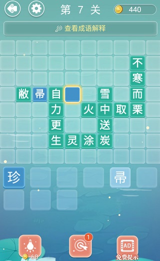 第7關(guān)答案:敝帚自珍、自力更生、生靈涂炭、雪中送炭、火中取栗、不寒而戰(zhàn)。