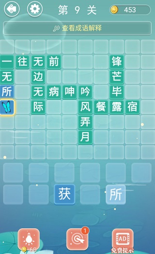 第9關(guān)答案:一往無(wú)前、無(wú)邊無(wú)際、無(wú)病呻吟、風(fēng)餐露宿、鋒芒畢露、吟風(fēng)弄月、一無(wú)所獲。