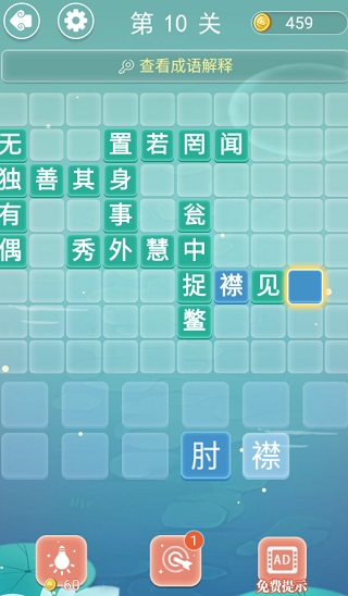 第10關(guān)答案:置若罔聞、無(wú)獨(dú)有偶、獨(dú)善其身、甕中捉鱉、秀外慧中、置身事外、捉襟見(jiàn)肘