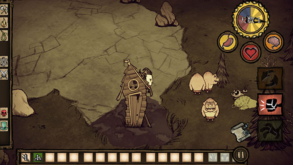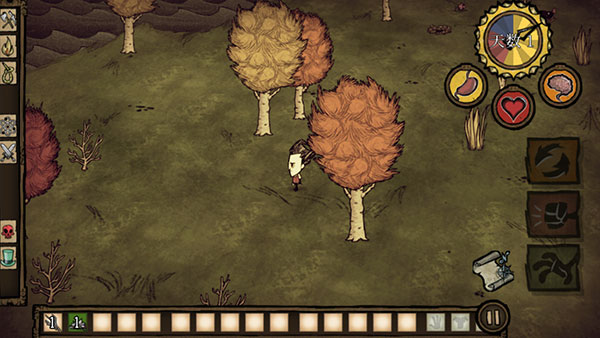 5、游戲就正式開始了,左邊是控制角色方向的,右邊是收集的,玩家需要收集一切能被利用的資源來躲避饑荒。