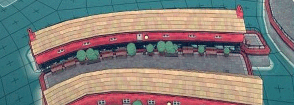 4、將成排的房屋地面鏤空,可以減少兩側(cè)的門,增加兩側(cè)的植物和長椅,會有公園的感覺。