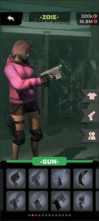 玩家點(diǎn)擊首頁(yè)store即可進(jìn)入商店,可以切換人物以及衣服,也可以購(gòu)買武器。