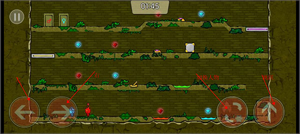 3、基本操作如下圖,你需要控制好游戲中的兩個(gè)角色,配合起來解決所有難題。收集所有的寶石,到達(dá)大門即可獲取勝利。