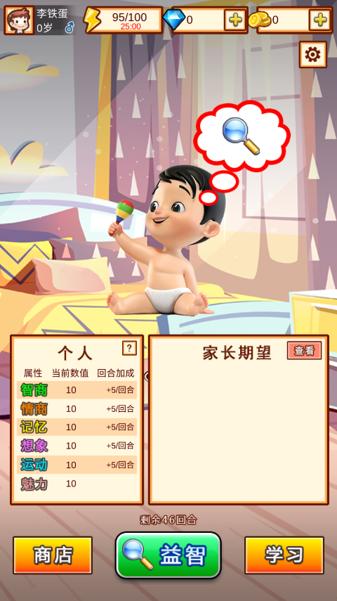 3、點(diǎn)擊尋找到右下角顯示的物品即可過關(guān)提高智商、情商、記憶、想像、運(yùn)動和魅力的回合加成。