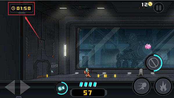 4、左上角顯示的是關(guān)卡的倒計時,玩家需要在倒計時結(jié)束前成功消滅所有敵人。在故事模式中倒計時無法增加,無盡模式中的倒計時可以通過拾取