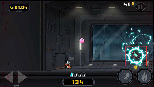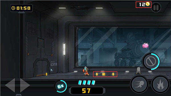5、左下角控制人物的左右移動,本游戲?qū)儆跈M板射擊類,玩家無法