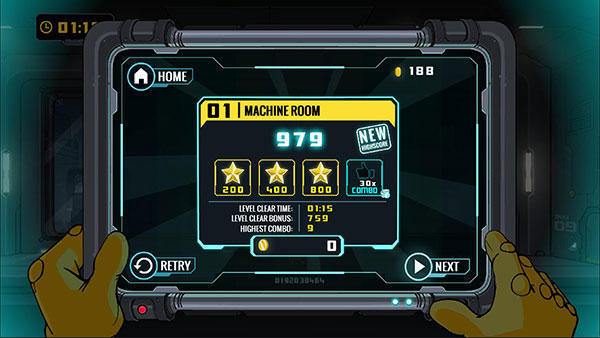 12、關(guān)卡的勝利界面顯示了玩家的通關(guān)時間、目標(biāo)完成度、游戲分?jǐn)?shù)、連擊數(shù)、分?jǐn)?shù)記錄。玩家可以點(diǎn)擊RETRY重新開始關(guān)卡、NEXT開啟下一關(guān)、HOME返回主界面的操作。