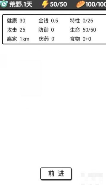 4、選擇愣頭青,就正式開始游戲了,,點(diǎn)擊前進(jìn),前進(jìn)和探索都會(huì)消耗精力,精力可以通過(guò)睡覺(jué)和喝啤酒來(lái)回復(fù)(啤酒等你到了縣城就會(huì)有了)