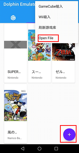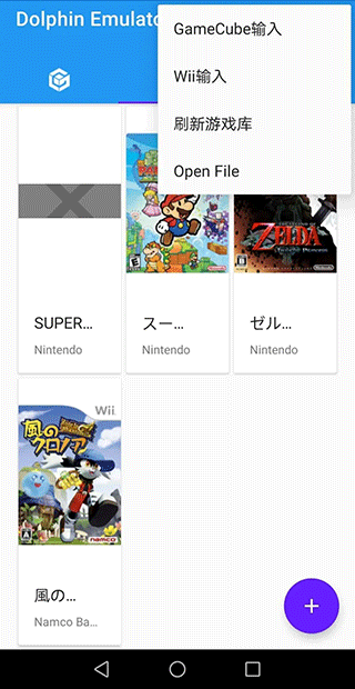 加載游戲的方式有兩種,一種是右上角更多-Open File打開(kāi)游戲Rom