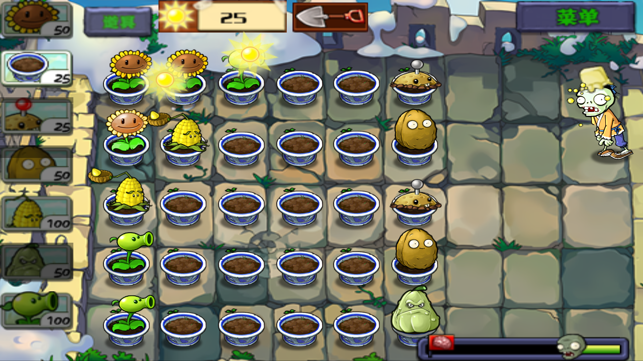 3.土豆地雷率先種在第一排抵御第一波僵尸。