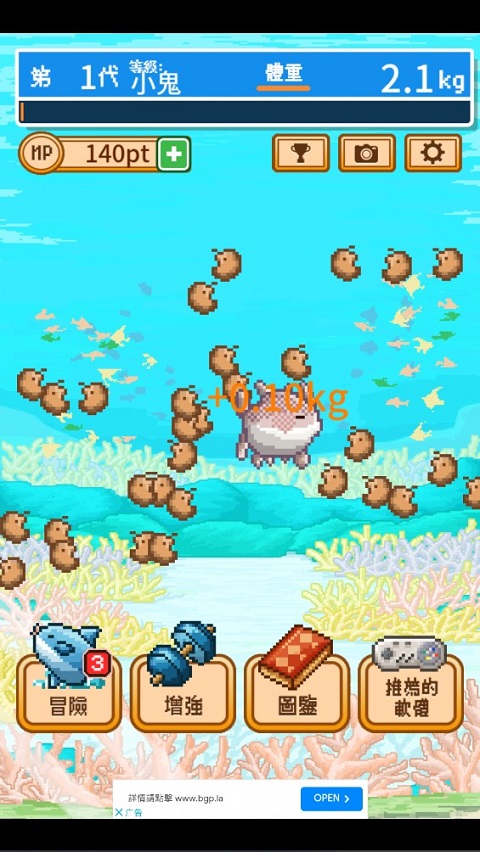 活下去曼波魚(Mola mola)是一款十分有趣的游戲,該游戲采用了十分經典的像素游戲風格,并且玩法也是十分經典,延續(xù)“大魚吃小魚”的傳統(tǒng)玩法,通過進食,實現瘋狂的進化!該游戲操作簡單,玩法有趣,點擊屏幕上出現的小水母、浮游生物即可增加體重!游戲中每一段時間,就能夠刷新食物,隨著游戲不斷發(fā)展,不斷的進化,就能夠輕松的解鎖新任務,開啟新的冒險。游戲中擁有多種游戲結局,玩家可以進行隨意探索!該游戲還提供的豐富的圖鑒功能,讓玩家能夠擁有收集感。感興趣的朋友不妨下載嘗試一番吧!