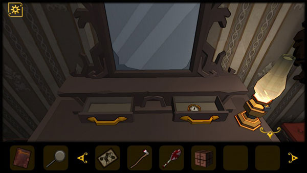 9、從鏡子下面的抽屜中獲得手表,點擊之前獲得的魔方道具,,點擊搜索按鈕將墻上的小魔方拼成獲得的魔方一樣的圖形即可解謎拿到寶石道具