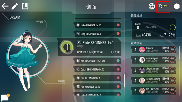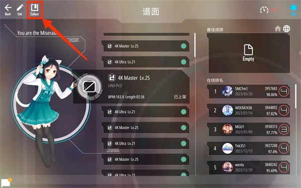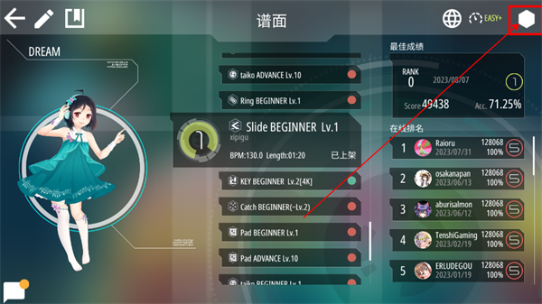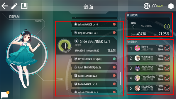 7、下面是打歌界面,中間是譜面的選擇,右邊是排行榜以及玩家的最佳成績