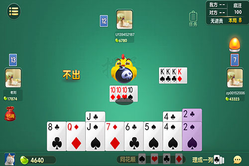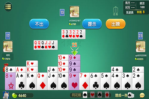4)接風(fēng):如果說(shuō)場(chǎng)上某一名玩家的最后一手牌出手之后,剩余的玩家全都接不住,那么下一輪游戲的出牌權(quán)就會(huì)交由他的對(duì)家,也就是他的隊(duì)友玩家。