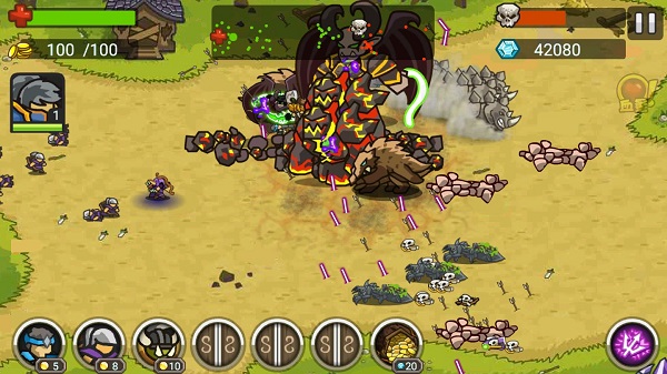 玩家進入關(guān)卡前先選擇要派出的英雄,士兵和可使用的技能;在關(guān)卡會自動增長金幣,消耗金幣選擇我們要召喚的士兵,用鉆石可以釋放技能幫助我們擊殺大量的敵人,把對方的大本營毀滅或者擊殺關(guān)卡BOSS即可獲得通關(guān)。