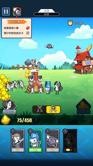 從游戲的名字中就可以知道這是一款魔性的玩梗游戲,在玩梗的基礎(chǔ)上其實(shí)玩法做的也不差。游戲中玩家需要操控礦工去挖礦,將礦物用來養(yǎng)兵,利用養(yǎng)出來的兵防守或者進(jìn)攻,直到摧毀敵方的防御塔為勝利,己方防御塔被摧毀則失敗。首先,個(gè)人認(rèn)為游戲的一大亮點(diǎn)就是這個(gè)兵種搭配了。游戲中的兵種其實(shí)還算得上不少,靈活搭配說不定會(huì)有出奇的效果。