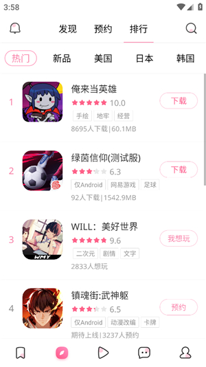 2、排行榜,國際范兒:每日同步更新App Store及Google Play的美國、日本、韓國、港臺等地區(qū)的游戲排行榜,分享全球玩家的游戲見解。