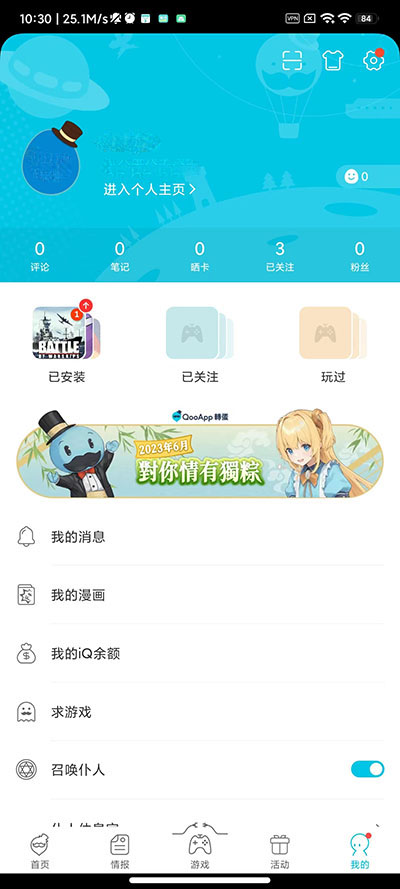 進(jìn)入QooApp主界面,點(diǎn)擊“我的”。