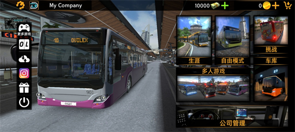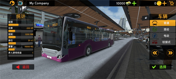 4、選擇一輛最適合自己的車輛,游戲內(nèi)提供多種常規(guī)/柴油、混合動力、電動和鉸接式巴士可供選擇,每種公交車的屬性都不相同,當(dāng)然需要耗費(fèi)的金額也不相同,你的初始金幣只有10000,你需要通過不斷的接送顧客,擴(kuò)大自己的公司規(guī)模才可積攢到更多的金錢哦!