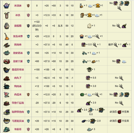 從第一幅圖中,我們可以看到回血最高的分別是曼德拉草湯和火龍果派以及華夫餅。但是曼德拉草湯雖然回血回的多,原料卻是太少了。一個地圖上能有三個曼德拉草就已經(jīng)不錯了。所以火龍果派是當之無愧的第一,成本低廉,并且吃的時候不會有停頓動作。
