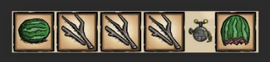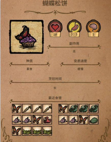 ①蝴蝶松餅:可以回20血,想要制作必須要有一個蝴蝶一個蔬菜,例如:1個蝴蝶+1個胡蘿卜+2個樹枝,或1個蝴蝶+1個紅蘑菇+2個冰。除了回20血以外,使用蝴蝶松餅還會回37.5點饑餓值和5點san值。