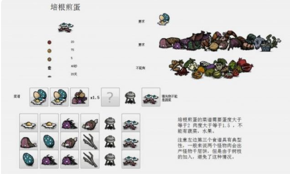②培根煎蛋:可以回20點血量,制作需要蛋度、肉度都>1.5,例如:2個蛋+1個怪物肉+1個小肉,或2個蛋+1個魚+1個怪物肉。