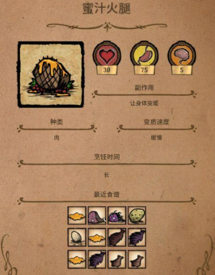 ③蜜汁火腿:可以回30血,想要制作必須要一個蜂蜜,例如:2個蜂蜜+2個大肉,或1個蜂蜜+1個冰+1個怪物肉+1個大肉。