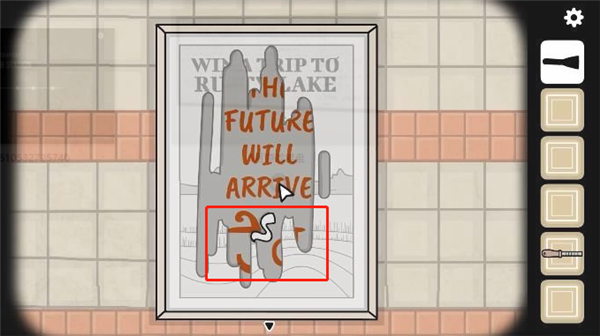 5、在嬰兒車旁邊的場(chǎng)景里有一張海報(bào),用鏟子把海報(bào)刮爛,就看到“THE FUTURE WILL ARRIVE”,也就是未來即將到來的意思。然后海報(bào)底部會(huì)出現(xiàn)一個(gè)神秘符號(hào)。