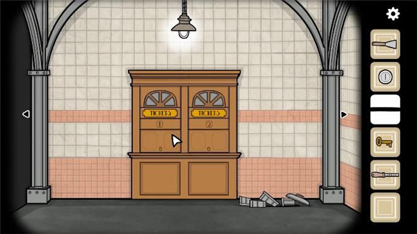 10、然后我們?nèi)サ嚼芭赃叺氖燮碧?,用鑰匙開門,用水管敲擊門框,叫醒售票員然后和她互動(dòng),提示我們需要一枚硬幣。