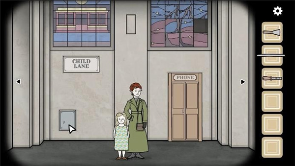 6、回到母女旁邊,發(fā)現(xiàn)勞拉不見了。點(diǎn)擊右邊的電話亭,用鑰匙打開門,然后撥打24355,發(fā)現(xiàn)需要一枚硬幣。