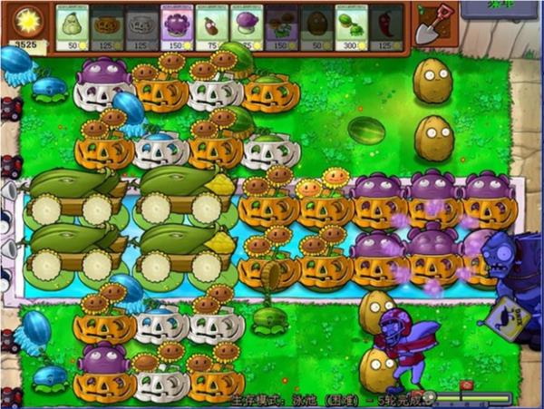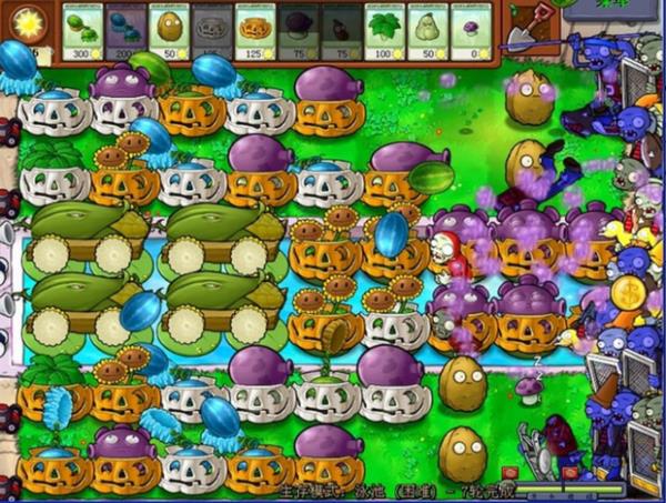 最可怕的僵尸是炸彈僵尸,當(dāng)炸彈僵尸的音樂(lè)出現(xiàn)時(shí),別猶豫,就是一個(gè)炸,可以適當(dāng)選用炸彈,還有,炸彈僵尸出現(xiàn)時(shí),可以選寒冰菇,缺點(diǎn)是費(fèi)錢(qián),以防萬(wàn)一,炸彈僵尸上陣時(shí)要選上睡蓮、大噴菇、咖啡豆,以便隨時(shí)補(bǔ)上戰(zhàn)斗力,如果陣容完整,巨型僵尸和冰車(chē)頂多走四個(gè)格子,所以沒(méi)什么可怕的,注意后路不要被礦工僵尸吃掉,隨時(shí)罩南瓜罩(如下圖所示):