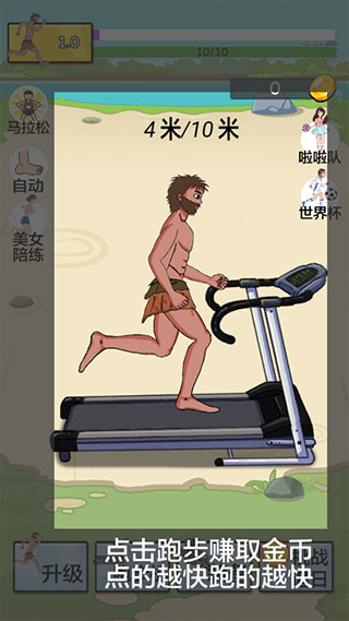 2、夸父在跑步機(jī)上跑步,初代跑步機(jī)10米獲得金幣獎(jiǎng)勵(lì),點(diǎn)擊屏幕的速度越快,跑的就越快。