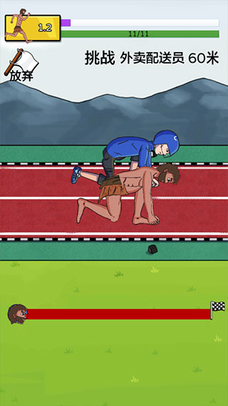 5、第一關(guān)是挑戰(zhàn)外賣員,60米路程,比誰先到終點(diǎn),同樣是點(diǎn)擊屏幕來增加速度的玩法。