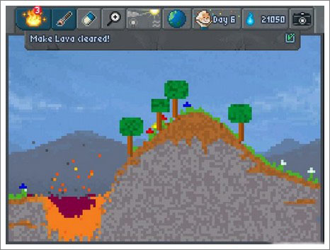用橡皮在山上挖一個(gè)坑,坑里放上油(oil),再用火點(diǎn)燃,得到巖漿(lava),本關(guān)完成。