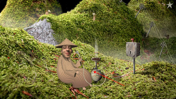 2、畫面轉(zhuǎn)換,點(diǎn)畫面中間最大那個(gè)農(nóng)民的煙袋,他會(huì)把煙吸完。再點(diǎn)一下煙袋,農(nóng)民把煙管丟在一旁。點(diǎn)擊煙管,修好機(jī)關(guān)。