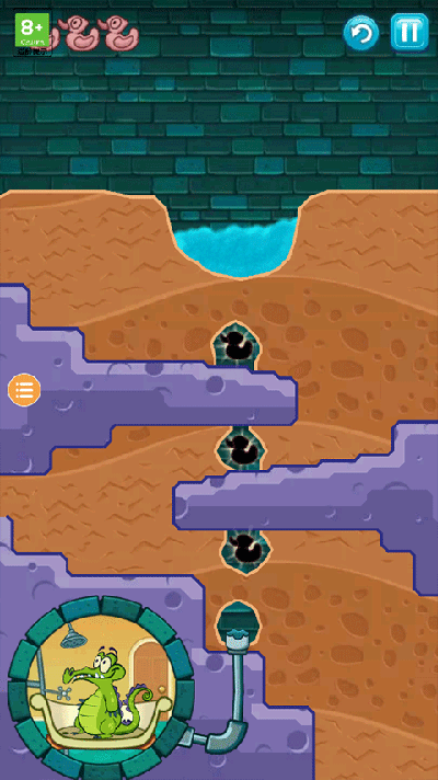8、挖出如圖一樣的路來,將清水引下,收集到最后一只鴨子,最后將水引入小頑皮的浴室即可過關(guān)。