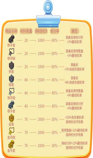 合成裝備需要消耗“水晶”,裝備合成失敗,則退還部分水晶,已花費(fèi)的游戲幣不進(jìn)行退還。各個(gè)裝備所需水晶、游戲幣根據(jù)裝備屬性不同而不同,詳情如下: