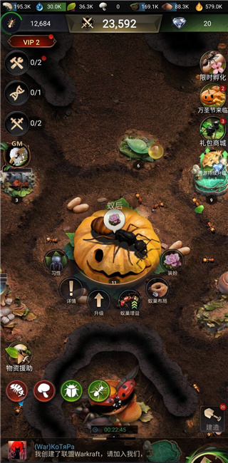 訓(xùn)練更多更高級(jí)的兵蟻,配合符合相應(yīng)兵種的特化蟻。孵化兵蟻是提升戰(zhàn)斗力的最快方式,但同時(shí)也要記得提升醫(yī)院哦,防止被人偷襲造成大量的兵蟻損失,因?yàn)槿绻t(yī)院容量不夠,無(wú)法得到救治的兵蟻會(huì)直接死亡。