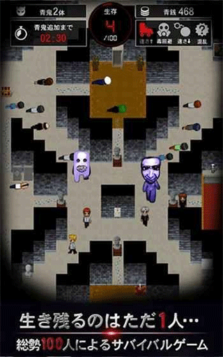 3、可怕的青鬼在地圖中自由游蕩,你必須要躲避他們,如果被他們發(fā)現(xiàn)你會被干掉的;