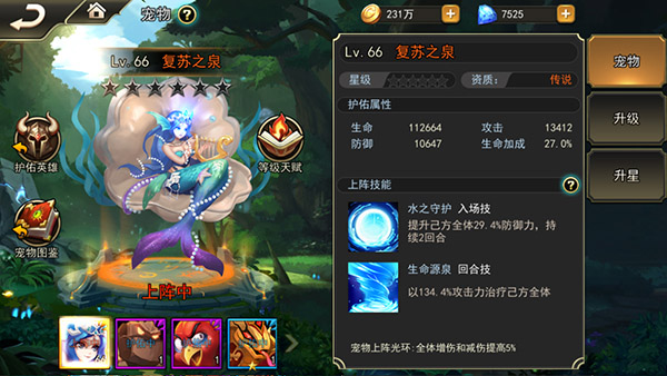 1、 復(fù)蘇之泉,金色寵物,入場提升己方全體防御力,持續(xù)兩回合;回合技是治療己方全體。這個寵物非常適合無奶的陣容,為團隊提供續(xù)航能力。